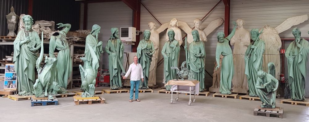 Le 11 avril 2019, cinq jours avant l’incendie qui a ravagé Notre Dame de Paris, les seize statues ornant le toit de la cathédrale étaient enlevées dans les airs grâce à une grue télescopique afin d’être restaurées.