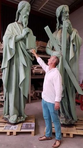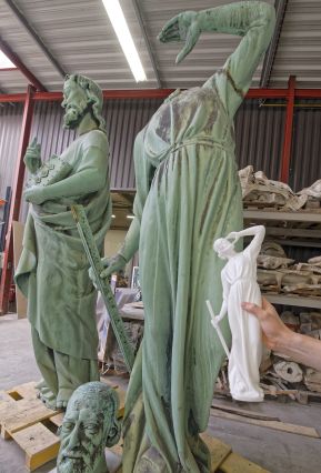 Ces statues sont en cuivre sur une armature en fer. Le cuivre étant un métal mou, les têtes des statues avait été démontées pour pouvoir s’accrocher sur l’armature lors de la descente en grue : c’est pourquoi, sur chaque statue on peut distinguer la marque de la soudure faite pour remettre la tête en place pour la photo.